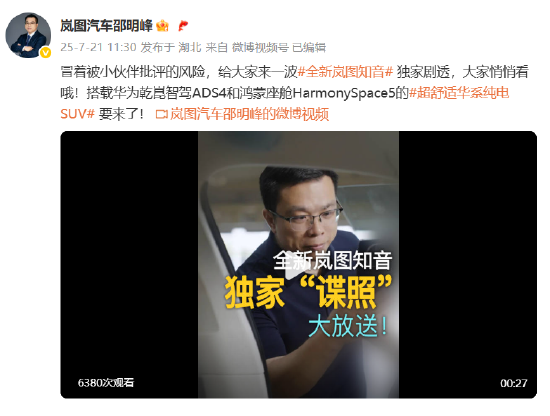 7月21日,岚图汽车CBO@岚图汽车邵明峰 在微博发布一条视频现金巴黎人娱乐城app平台,提前泄漏全新岚图知音的内饰细节。